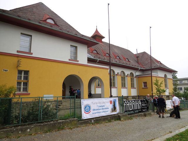 Na start pochodu do sokolovny v Humpolci jsme se z Jihlavy vydali autem Jitky a Honzy Korbelových společně s Ivou Svobodovou a její fenkou Adinou – počasí nebylo zrovna vstřícné, ale podle předpovědi by se mělo rozpršet až odpoledne, tak uvidíme (dosud bylo velké sucho)… Na startu nás kromě pořadatelů vítal nový barevný banner propagující dnešní pochod, který se celým názvem jmenuje Cestami Oktaviána Strádala za opečeným špekáčkem – o význačném humpoleckém turistovi panu Strádalovi jsem psala ve článku z roku 2011.