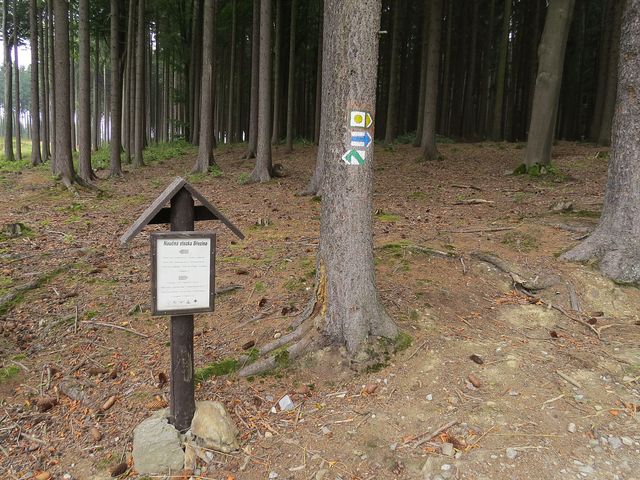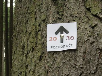 Po modré turistické značce jsme pokračovali až k rozcestí na Bysterské silnici, odkud jsme se vydali po žlutě značené pěší trase k Městské hájovně a odtud nás vedla zelená značka. Pečliví pořadatelé ještě navíc umístili po celé trase papírové kartičky 7×7 cm s příslušnou směrovou šipkou – úžasný (a časově i organizačně velmi náročný) počin! Inu, předseda KČT Humpolec se jako zkušený značkař nezapře! 🙂