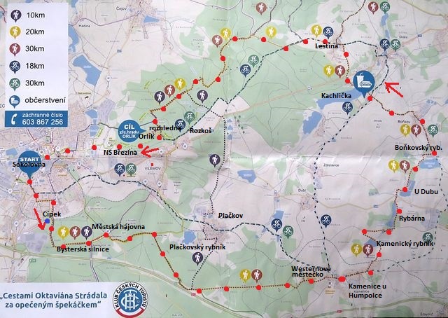 Z nabídky tří tras jsme si vybrali střední, 20 km dlouhou. Při registraci jsme od pořadatelů dostali popis zvolené cesty a krásnou přehlednou mapu:
