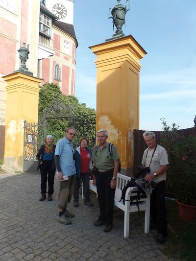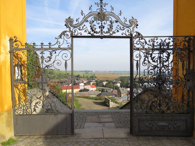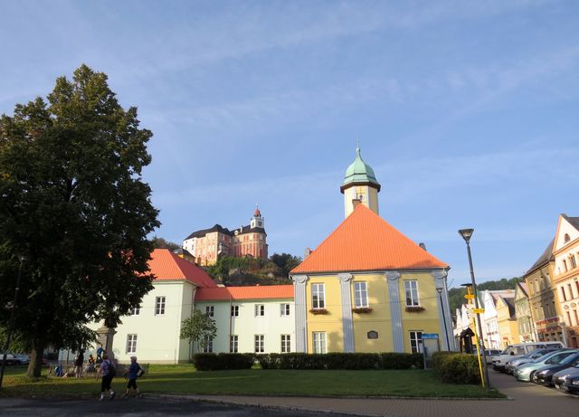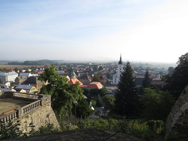 Přímo z náměstí vedou schody na zámecký kopec (340 m n. m.) – okouzleni jsme stanuli na terase a hleděli na město, ze kterého vystupovala bělostná věž kostela Nejsvětější Trojice a podzimní ranní mlhy halily na rovině za blízkou hranicí polské vesnice.
