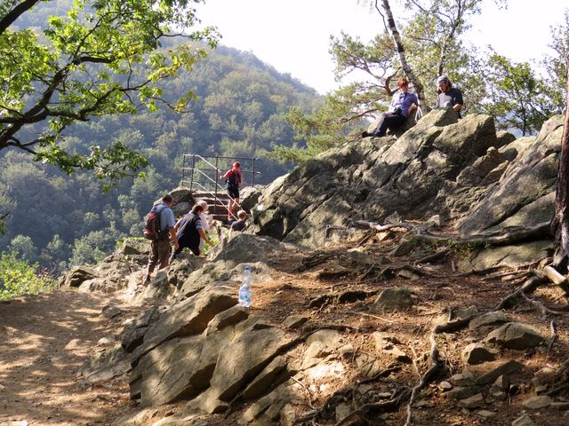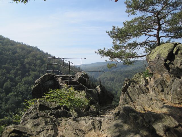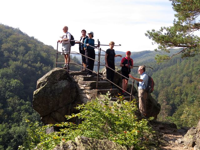 Atraktivní trasa nás vedla k Čertově kazatelně, rulovému útvaru s 13 metrů vysokou kolmou stěnou, z níž je úžasný pohled do kaňonu Račího údolí.