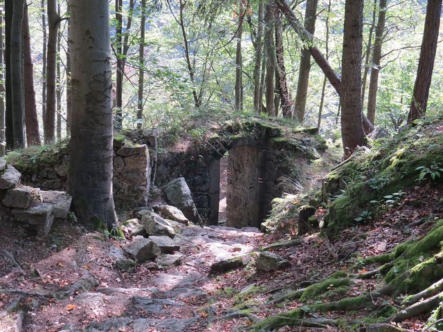 Došli jsme k místu v prostřední části Račího údolí nazvanému Kaštanová alej – na informační tabulce směrovníku jsme se dočetli, že právě zde byl za 2. světové války německý zajatecký tábor. Zahnuli jsme prudce vlevo a přes hřeben přešli do vedlejšího údolí.