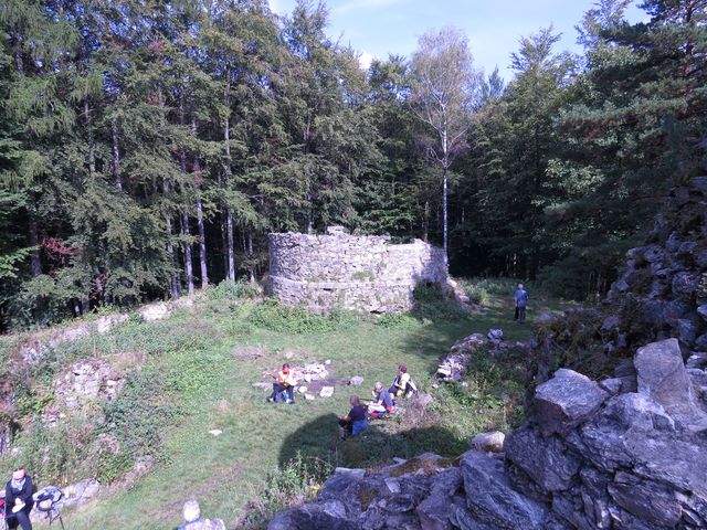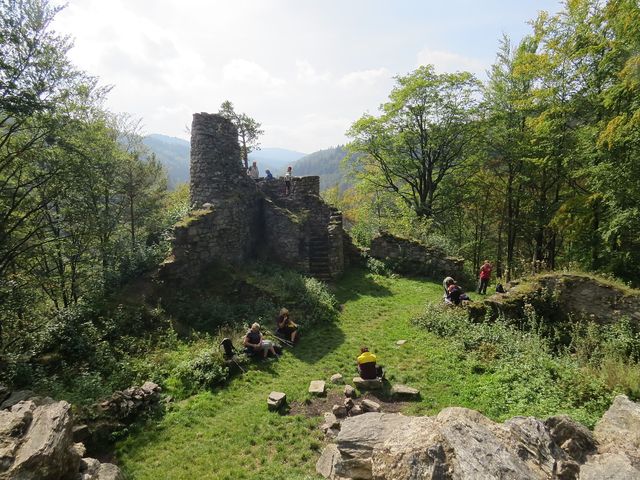 Na protější straně Račího údolí jsou zbytky středověkého strážního hradu Pustý zámek, který sloužil k ochraně kupecké stezky do Polska – my jsme od Čertovy kazatelny zamířili po hřebeni k dalšímu hradu, který byl na hřebeni nad 7 kilometrů dlouhým údolím postaven ve 13. století také jako ochranný. Jeho původní jméno není známo, podle pohoří byl později hrad pojmenován Rychleby (Reichenstein). Začátkem 20. století opravili a zpevnili místní milovníci historie zdejší ruiny, aby alespoň zbytky gotického hradu zůstaly zachovány pro budoucnost – při romantické úpravě však došlo k porušení původního půdorysu.
