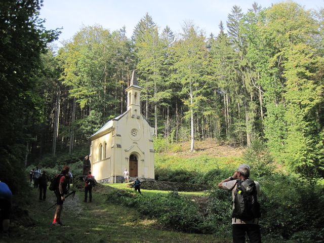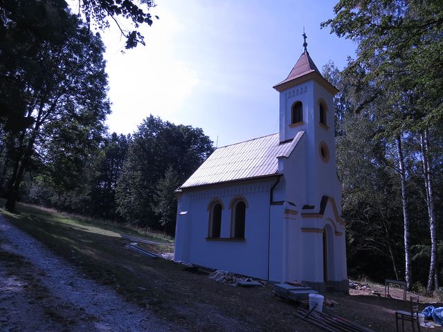 Bylo 11 hodin, když jsme opouštěli zámecký areál – dnešním cílem bylo poznat část Rychlebských hor směrem do vnitrozemí (velmi volně řečeno). První zastávkou na červeně značené turistické cestě byla kaple sv. Antonína na Písečném vrchu.