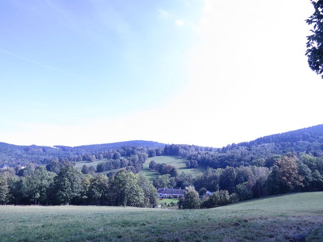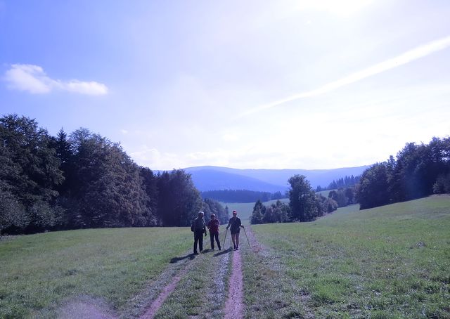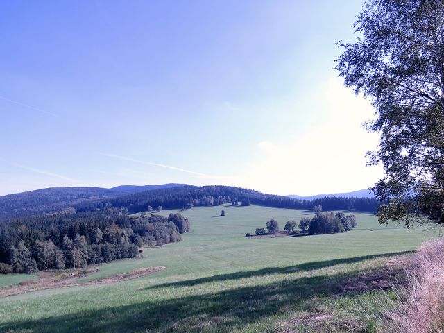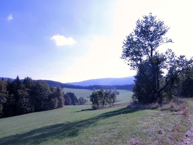 Vyparáděná obloha, daleké výhledy z holého členitého hřebene s pastvinami a remízky na zalesněné hraniční hory – byla to krásná cesta!