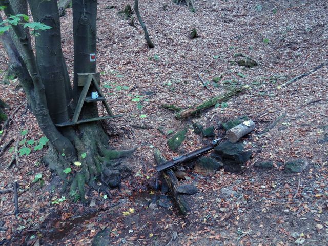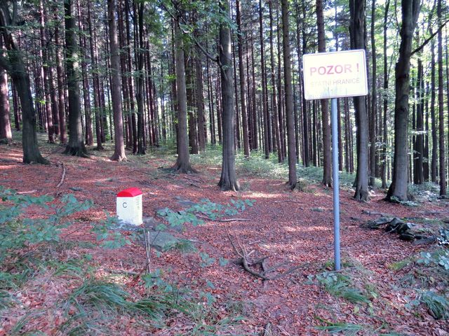 Sestoupili jsme do údolí k hranicím a znovu (po kolikáté už?) začali stoupat na hřeben – červená značka nás vedla lesem k rozcestníku nazvanému Pramen pod Stráží.