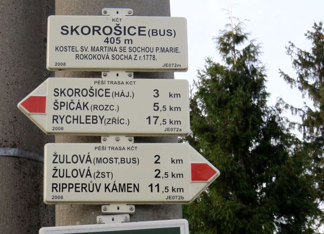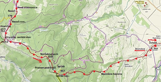 Na rozcestí pod Špičákem jsme opustili hranici a vydali se na východ, směrem k Žulové – až k hájovně nás vedl Skorošický potok, pak silnička do Skorošic, kde na nás čekal autobus.