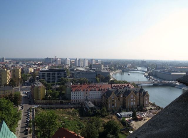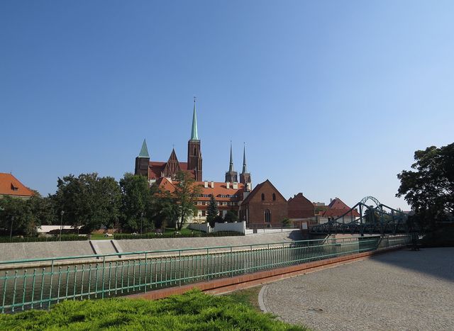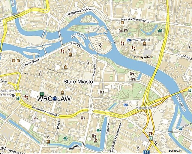 Na mapce v pravém dolním rohu je zaznamenáno parkoviště, z něhož jsme přes Grunwaldský most přešli na pravý břeh řeky a odtud na katedrální ostrov – už při letmém pohledu na plán města nikomu neunikne, že Dómský ostrov je už ostrovem jen podle jména – kvůli záplavám bylo v 19. století zasypáno pravé koryto Odry; skutečným ostrovem, na který se musí po mostě, je jen ten vedlejší (Piaskowy) s kostelem Panny Marie na Písku.
