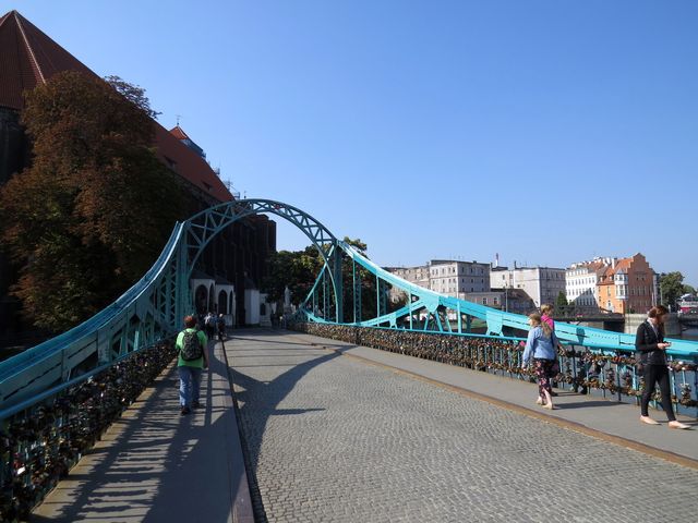 Bylo nám přejíti po mostě zamilovaných na Pískový ostrov – ocelový most 52 metrů dlouhý a skoro 7 metrů široký, ozdobený sochou sv. Jana Křtitele na jedné a sochou sv. Hedviky na druhé straně, je nejstarší z vratislavských mostů – na jeho rodném listě je číslice 1845. Na most natřený jásavou tyrkysovou barvou chodí stvrzovat svoji nehynoucí lásku pošetilci, kteří kvůli tomu zatěžují zábradlí zámky a koryto Odry znečišťují kovovými klíčky…