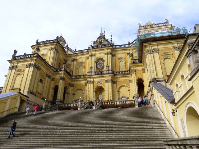 Ke kostelu vede monumentální trojité schodiště – počet schodů prostřední části symbolicky upomíná na 33 pozemských let Ježíše Krista, dalších 15 schodů představuje léta Mariina života před jejím mateřstvím – celkový počet kamenných stupňů je v každém písemném prameni udáván různě: 52 až 56 🙂 a tomu je přizpůsobeno vysvětlení – buďto čtyři evangelisté či ještě někdo další. My jsme je bohužel nespočítali, každopádně působí schodiště impozantně, po jeho stranách jsou ještě kryté schody do baziliky.