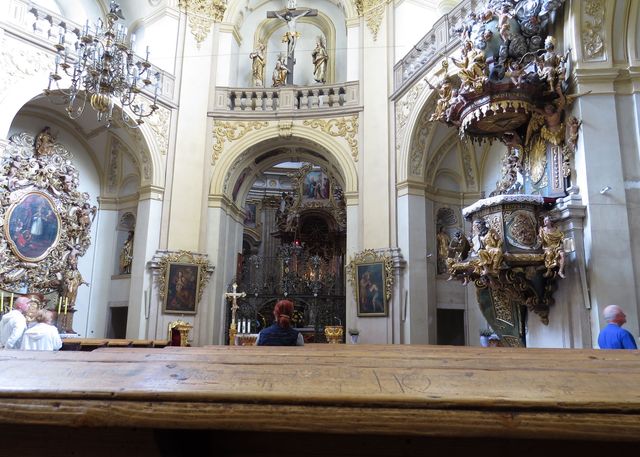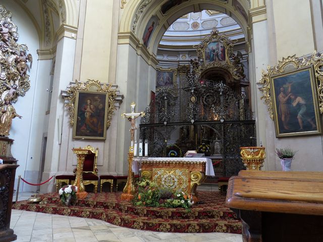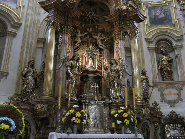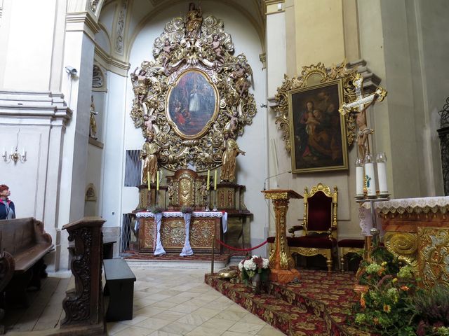 Hlavní oltář je vzácná ruční práce řezbáře Karla Flackera, stříbrný svatostánek vyrobili benátští zlatníci.