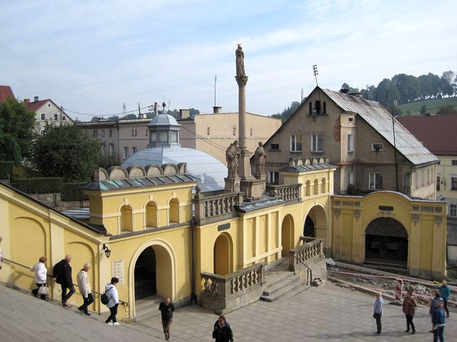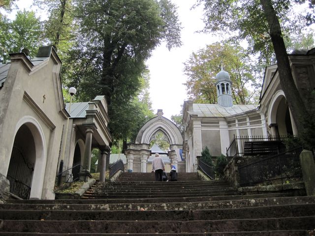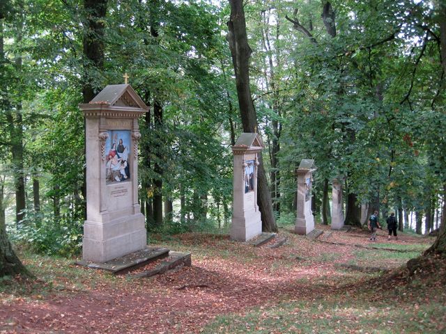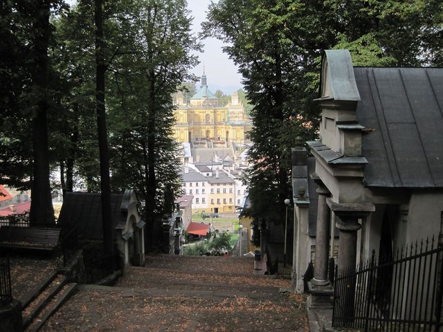 Náš čas byl limitovaný, proto z návrší sionského rychle aspoň nahlédnout na protější Kalvárii, abychom získali představu o zdejších exteriérech a síti poutnických cest. Původní kaple byly průběžně přestavovány až do první poloviny 20. století. Na svahu hory proti kostelu vzniklo v 19. století terasové uspořádání, čímž se ustálily trasy, kterými podle vzoru Jeruzaléma putovali věřící z městské zástavby na Kalvárii a odtud na Novou horu (Tábor, Sinaj). Křížová cesta vznikla v roce 1732 – není snadné, aby náhodný návštěvník udržel správný směr v husté síti kapliček, a tak jsme prostě šli vzhůru rovnou za nosem… 🙂