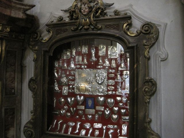 Nejen v ochozech oválné baziliky, ale všude v interiéru jsou votivní obrazy a dary jako díkůvzdání za uzdravení a pomoc věřícím.