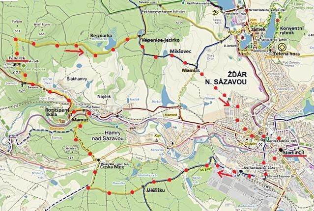 Trasa turistického pochodu: start v ZŠ Palachova MTZ – nádraží ČD – Žďas – U Křížku ŽTZ – Česká Mez – Mamut – Rozštípená skála – Konec světa – rozcestí Samotín – Peperek – rybník Rejznarka – jezírko Vápenice MTZ – rybník Mikšovec – Mamlas – neznačenou cestou do Žďáru – prohlídka města – cíl ZŠ Palachova = 22 km