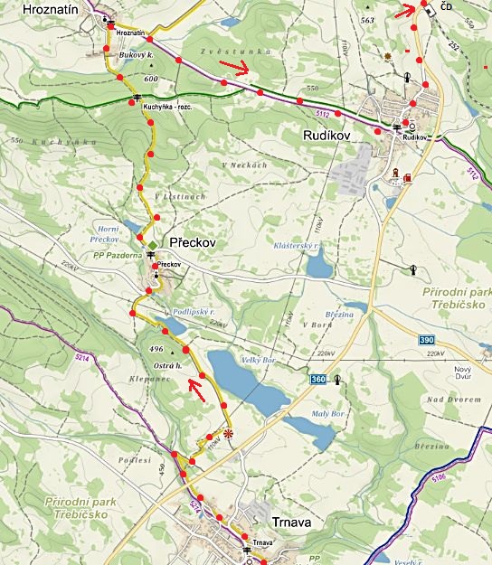 Trasa: Trnava ŽTZ – Přeckov – rozcestí Kuchyňka – Hroznatín – po cyklostezce do Rudíkova – nádraží ČD Rudíkov + po Jihlavě = 18 km