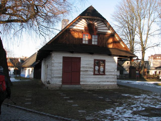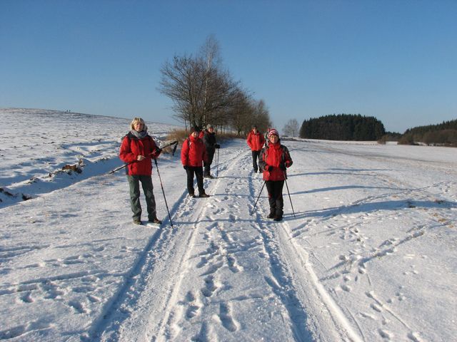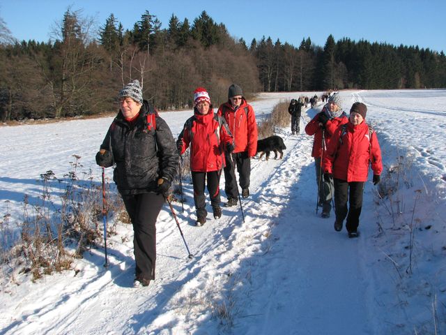 Naše šestičlenná skupinka (bez Mirka, který si doma foukal na bolístku) přijela po přestupu v Havlíčkově Brodě do Hlinska vlakem, před nádražím jsme se po chvilce čekání dostali spolu s neuvěřitelným počtem turistů do autobusu mířícího ke Svratce, odtud jsme pak jeli do Svratouchu téměř sami. Jakmile jsme vystoupali na zasněžené louky nad obcí, záležel další přesun už jen na naší vůli – výšlap slunečnou vysočinskou krajinou pod čistým modrým nebem se dal zařadit do kategorie s názvem „luxusní“.