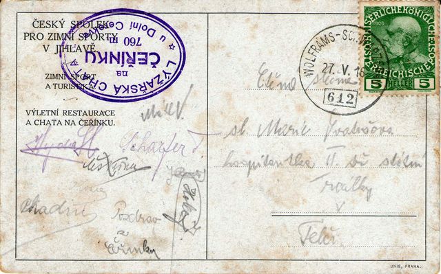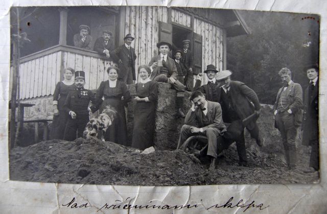 15.8.1913, odbor z Počátek: výprava naše přijavše pozvání jihlavského odboru v počtu 19 osob po dlouhém bloudění chatu nalezla, prohlédla a účelnou seznala, vydáváme jejím tvůrcům vřelý sportovní dík – jednatel.