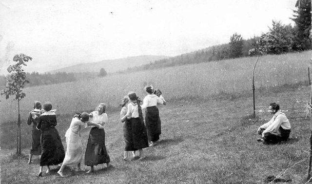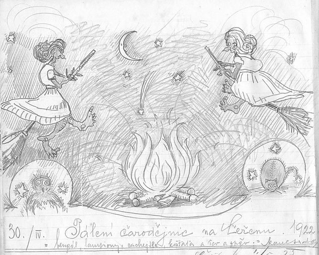 U následující fotografie je v knize dne 13. 6. 1915 popisek: Satyr hlídá křepké tance svěřených mu nymf a rusalek, zatím co Faun snaží se jejich živou radost zachytit pro anály bible chaty na Čeřínku.