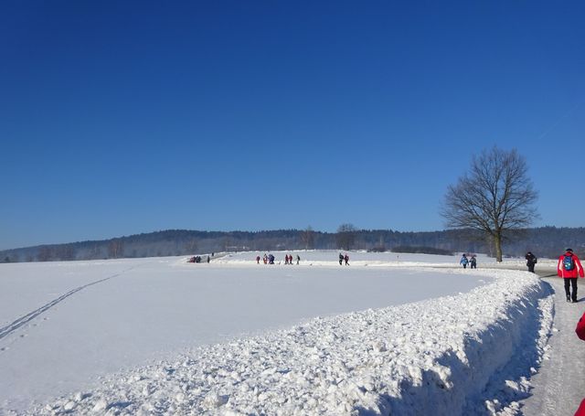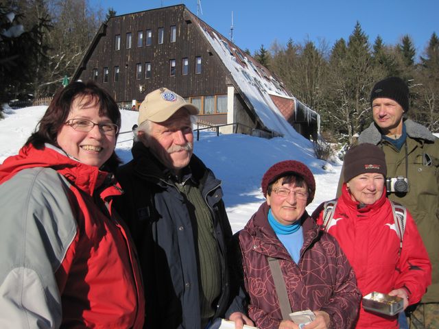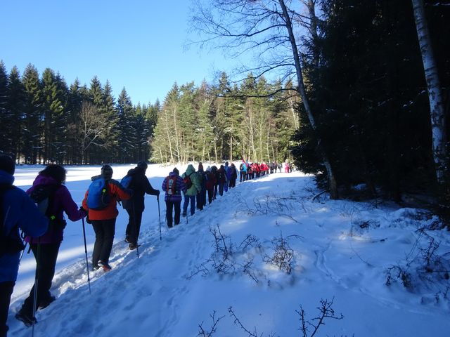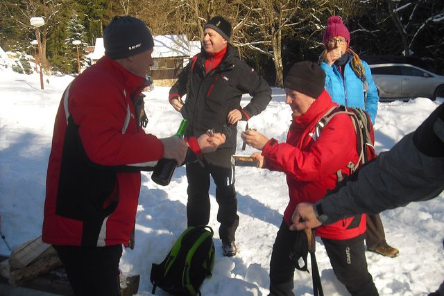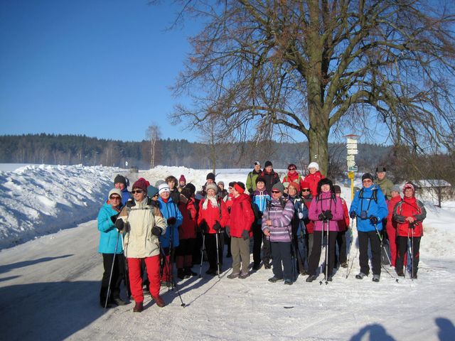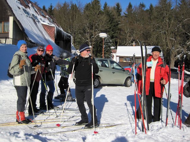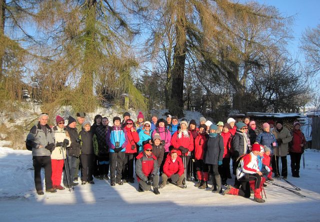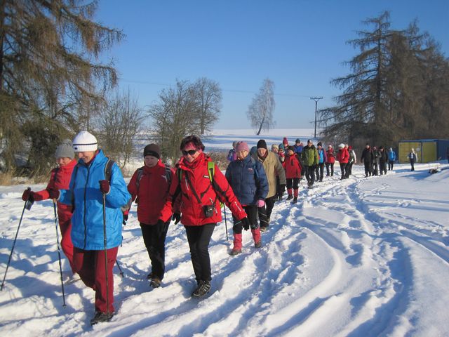 Byl den jako malovaný – v noci sice sužoval krajinu velký mráz, ale před desátou, když jsme vystoupili v Kostelci z vlaku, svítilo už slunce a teploměr ve stanici ukazoval -5°C. Po obvyklém uvítacím projevu jsme se vyfotili a vydali se silnicí k Čeřínku – sníh na okolních polích zářil, hradba stříbrného lesa na kopcích, k nimž jsme mířili, stála nehnutě, pohádkově.