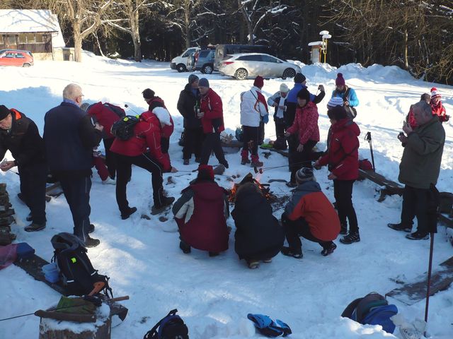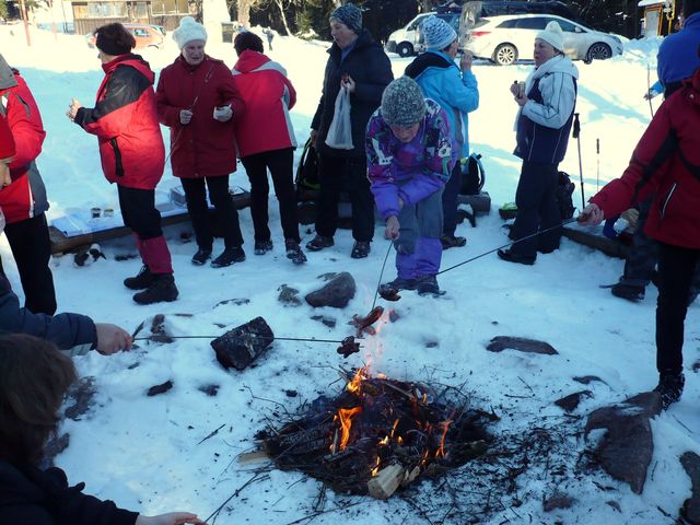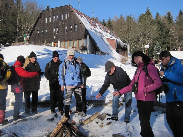 Na plošinu před chatami, poblíž stoletého smrku, pro nás nájemce turistické chaty Zdeněk Vlček nachystal suché dřevo, a tak mohli Jirka s Mirkem slavnostně zapálit oheň, který příchozím poskytl teplo, ale i možnost opéci klobásky neprodleně vytahované z batůžků.