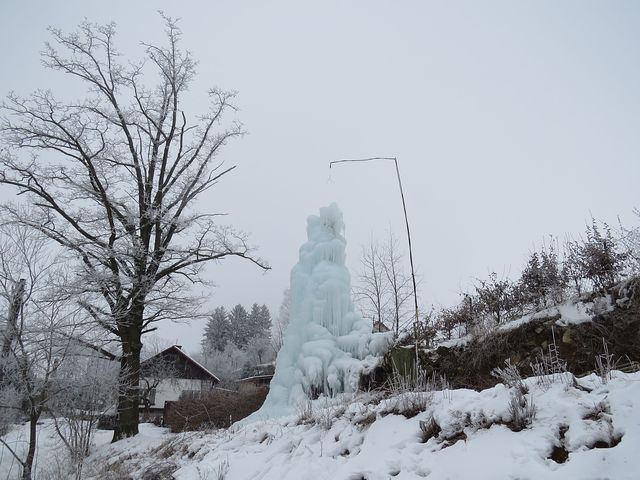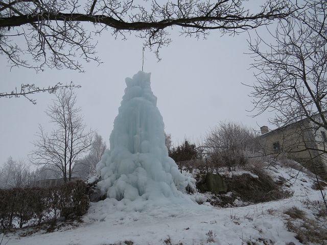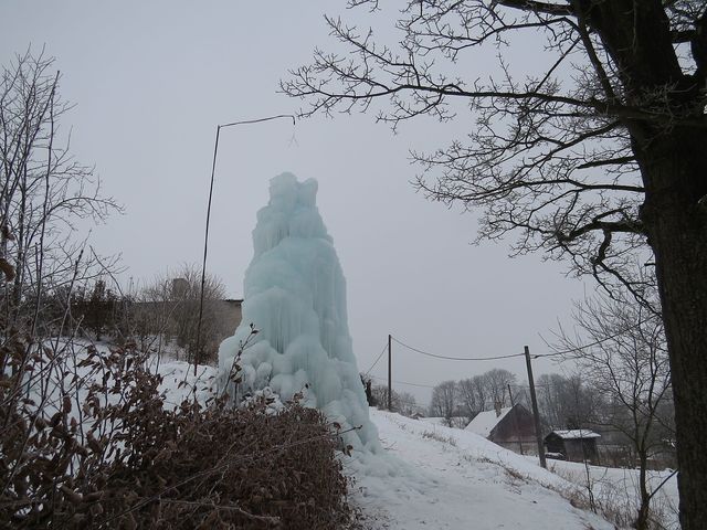 Prošli jsme celý Hybrálec a až na okraji uviděli několik metrů vysoký ledový zámek – zvědavě a s uctivostí jsme obcházeli objekt vytvořený spoluprací člověka (konkrétně zdejšího občana pana Rychteckého) a přírody – jemná vodní mlhovina tryskající z trubky postupně za pomoci mrazu a větru vytvořila bělostnou pyramidu s chladně modrým nádechem – zajímavý výsledek několikatýdenního procesu byl rozhodně dobrým cílem pěšího výšlapu.