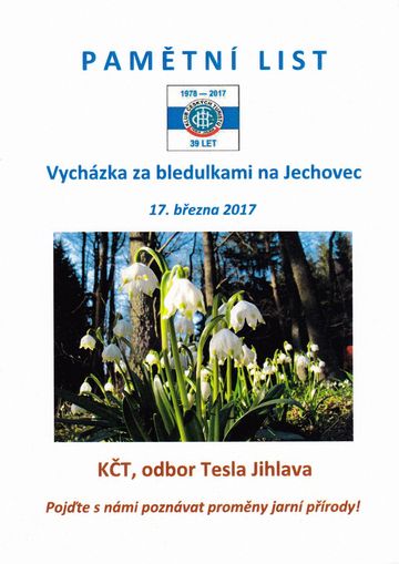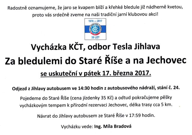 Jako každý rok očekávali jsme v polovině března s netrpělivostí psaníčko, v němž nás pořadatelé z KČT Tesla Jihlava vyzvou ke společné návštěvě lesa Jechovce u Staré Říše. Možná namítnete, proč čekáme na pozvání a nejdeme na vycházku sami?! Protože se potřebujeme sdělovat – je vyzkoušené, že samotný člověk má na bledulišti problém – komu říct prosté „To je krása“…?… souznění ten každoroční zázrak přírody umocňuje…