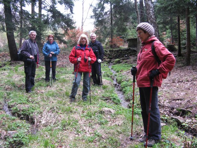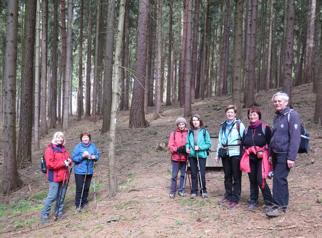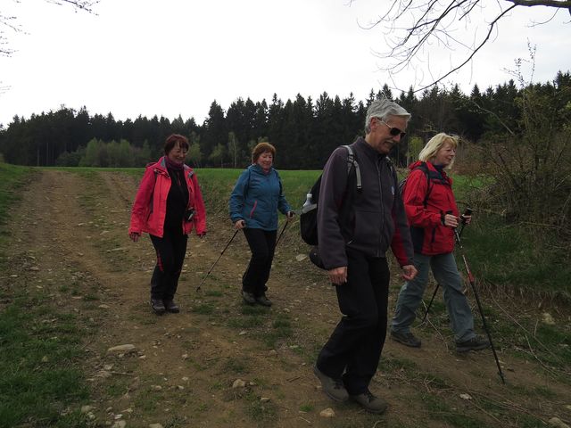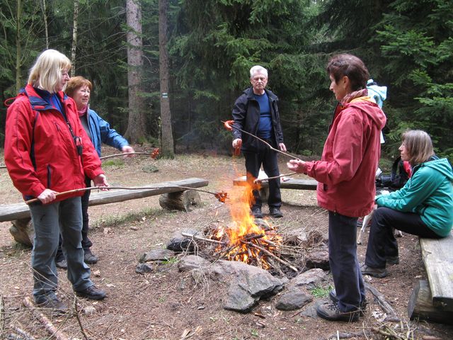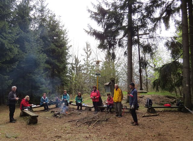 My jsme se však na vrcholové plošině zachovali velice prozaicky – z dříví nasbíraného vůkol jsme rozdělali ohníček a opekli si klobásky. To už jsme za sebou měli skoro 20 kilometrů, takže je jasné, že krmě přišla vhod a odpočinek také. Co si tak lebedíme, vynořili se z lesa dva kolegové-cyklisté, kteří si upravili v propozicích navrženou trasu a věřili, že se s námi setkají na tomto strategickém místě. Můžeme tedy uvést, že Velikonoční přechod Arnoleckých hor pořádaný Klubem českých turistů, odborem Čeřínek Jihlava absolvovalo osm pěšáků a dva cyklisté.