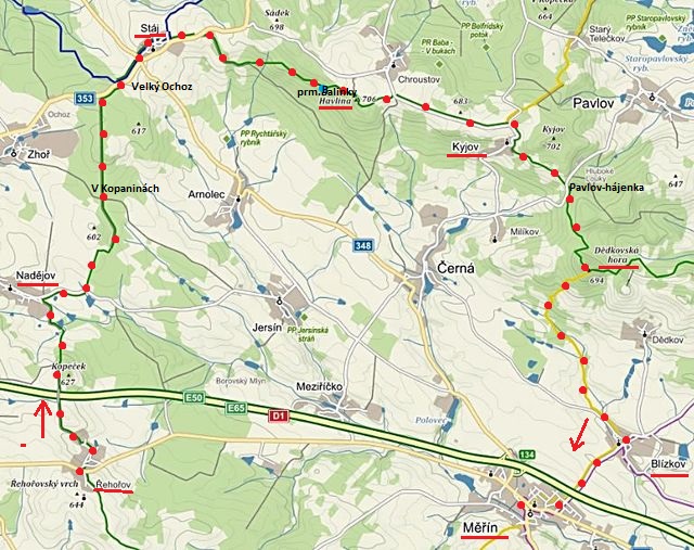 Soupis lokalit, kterými jsme procházeli: Řehořov – evropské rozvodí Kopeček (627 m n.m.) – Nadějov – V Kopaninách (623 m) – rozcestí Velký Ochoz (600 m) – Stáj – pramen Balinky – Havlina (707 m) – Kyjov (703 m) – hájovna Pavlov (648 m) – Dědkovská hora (694 m) – Blízkov – Měřín.