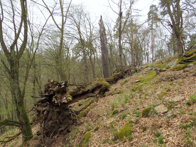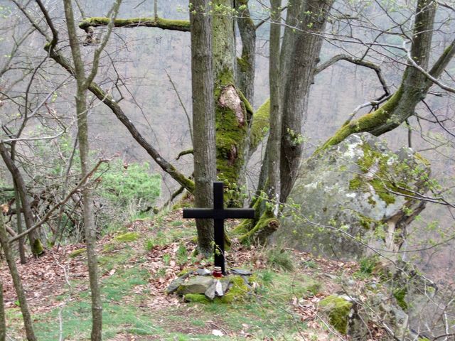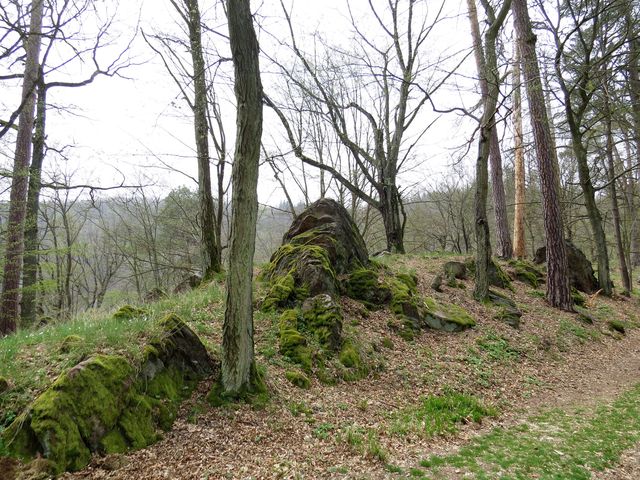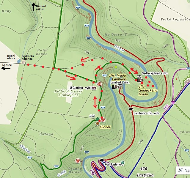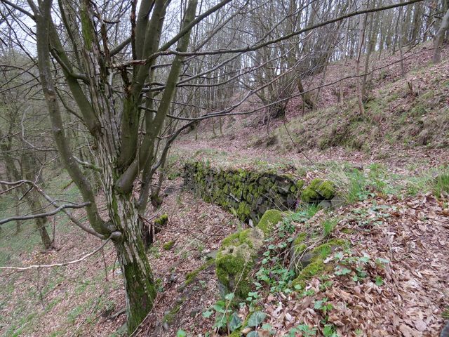 Na mapce je vidět, že při návratu jsme na části trasy zvolili jinou cestu – ta pravděpodobně bývala původním přístupem k hradu – v několika místech musel kdysi být příkrý sráz zajištěn podpůrnou kamennou zídkou.