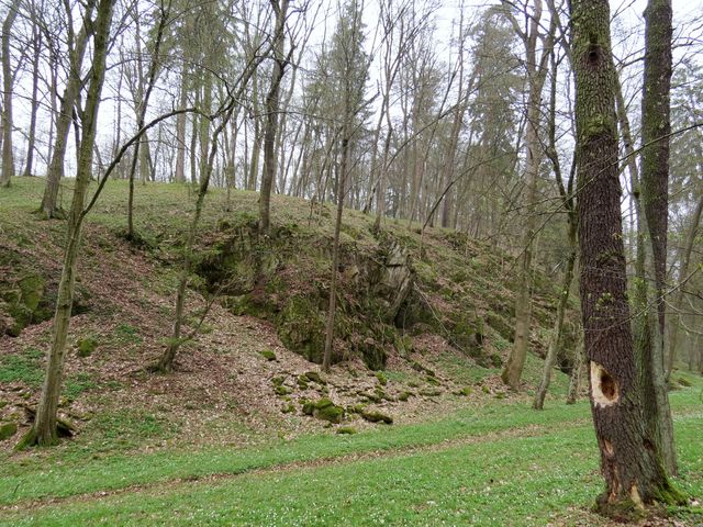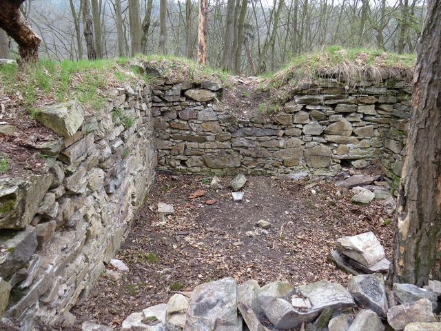 Změny okolního reliéfu brzy signalizovaly bývalé opevnění a terénní vlny dávaly tušit někdejší rozsáhlou stavbu – došli jsme na vysoký ostroh nad řekou, který lidé obydleli na konci 13. století, ale osud určil, že role hradu v těchto těžko prostupných lesích a bezcestí bude ukončena už v polovině 16. století.