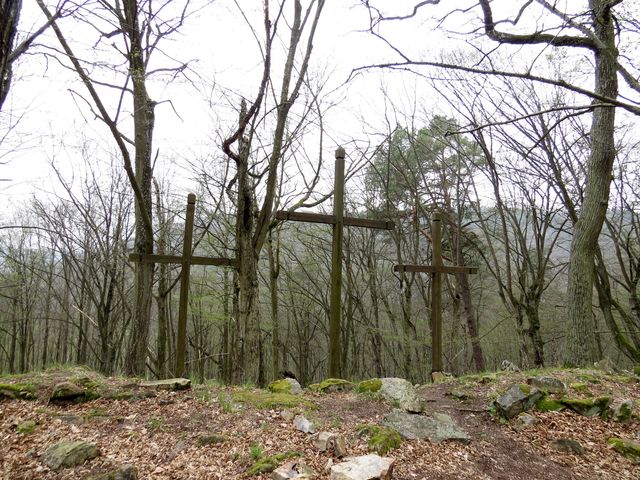 Tři kříže stojící od nepaměti v místech bývalých hradeb jsou obestřeny tajemstvím a mnohými, někdy i velice rozdílnými pověstmi – povídá se, že tři bratři ulovili jelena a při hádce o něj se vzájemně pozabíjeli, ale mnohem romantičtější je pověst o nešťastných dcerách, které i s jejich matkou uschoval na některém utajeném místě v okolí jejich manžel a otec, tehdejší správce hradu, když se v dobách neklidných a nejistých chystal na cesty. Jak už to bývá, okolnosti mu nedovolily dodržet časový plán a při návratu je nalezl všechny mrtvé. Tento příběh se vypráví v mnoha variantách – jisté je, že místo „U třech křížů“ bylo mezi lidmi známé, uctívané a udržované, docházela sem procesí.