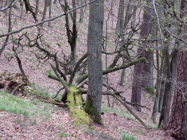Udržovanou lesní cestou jsme mířili na křižovatku nazvanou na turistickém směrovníku U Glorietu – vyhlídka. Na podzim jsme tuto část cesty vedoucí po hřbetu srázu nad Divokou roklí procházeli, tak jsme se nebránili srovnávání přírody v různých ročních obdobích.