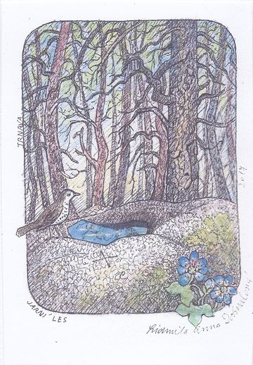 Jak jinak ukončit článek o přírodě nežli obrázkem umělkyně-milovnice přírody…? Zachytila na něm charakteristický symbol kraje v okolí Trnavy u Třebíče – kolomazný kámen.
