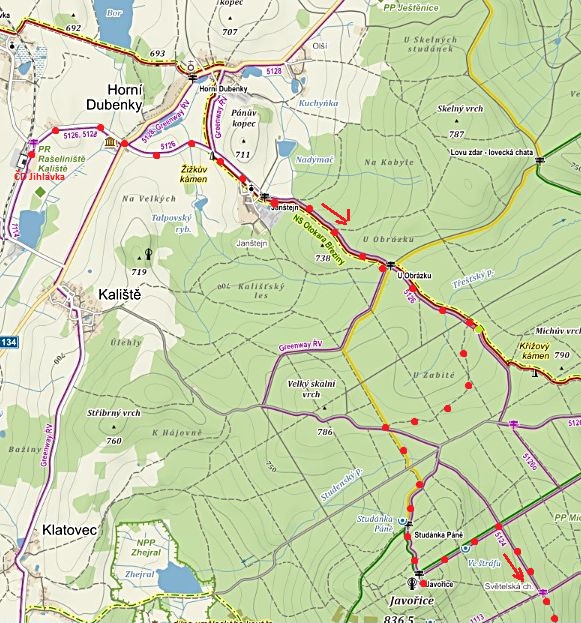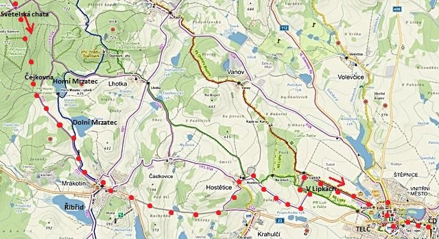 Jihlávka – Janštejn – U Obrázku – Studánka Páně – Javořice (837 m) – Světelská chata – Čejkovna – Mrákotín – Hostětice – Lipky – Telč – ČD = 22 km (+ 3 km po Jihlavě)