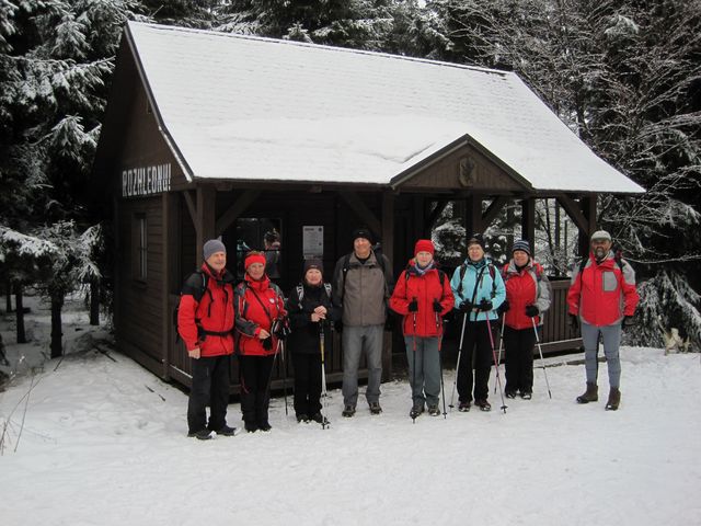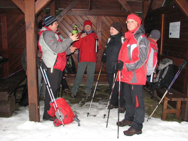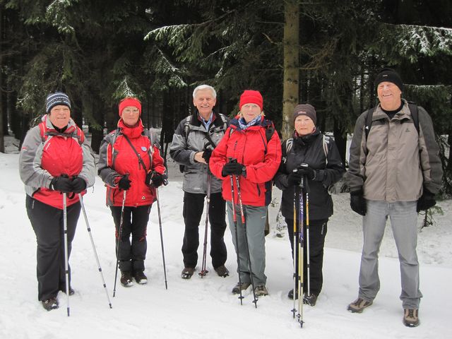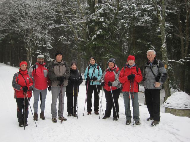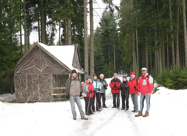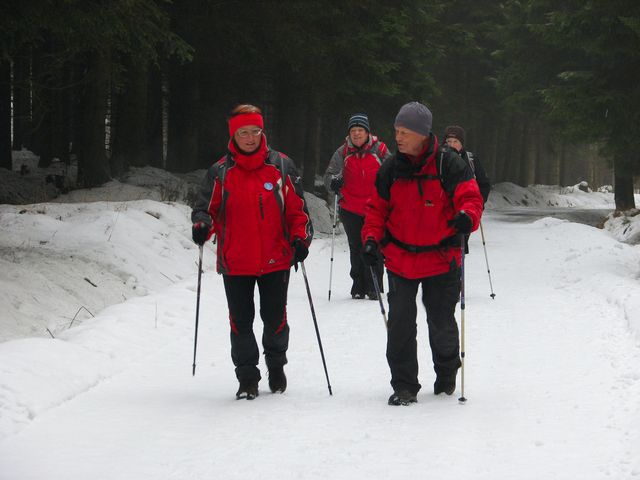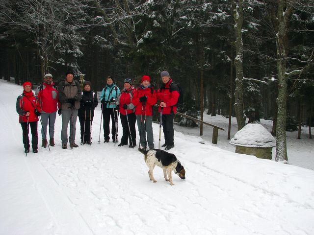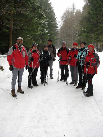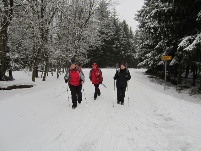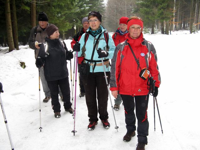 Za Jihlávkou, směrem k Janštejnu, byla mírně zledovatělá silnice, jakmile jsme vkročili do lesa, bylo dobře – trasa k vrcholu není náročná, většinou jsme šli zasněženými lesními cestami pospolu a probírali otázky zajímající všechny účastníky. 🙂