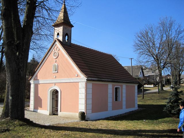 Ze Sokolíčka do Suché jsme museli zase přes kopec – už z jeho temene jsme viděli velkou úpravnou náves se světlými stěnami kapličky,
