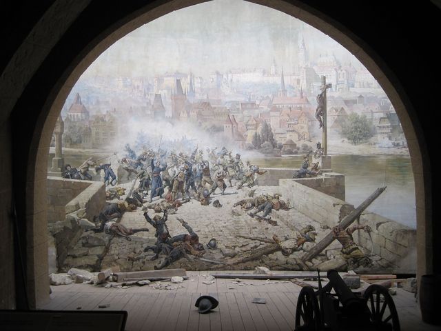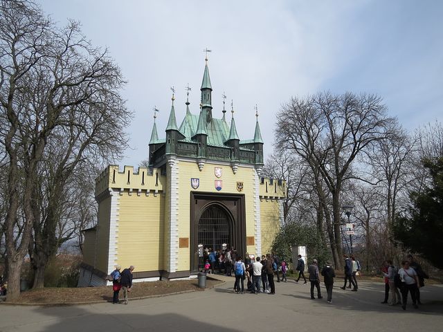 Při příležitosti výše zmíněné Zemské výstavy byl vystavěn pavilon, iniciovaný rovněž Klubem českých turistů – budova připomínala středověkou vyšehradskou bránu, devítivěžovou Špičku, která v té době už nestála. Hlavní atrakcí pavilonu bylo diorama vytvořené za 50 dní bratry Liebscherovými, nazvané „Bitva se Švédy na Karlově mostě v roce 1648“. V pavilonu byly další panoramatické obrazy a fotografie české krajiny. Po skončení výstavy byl pavilon přenesen na Petřín a zřízeno v něm bludiště.