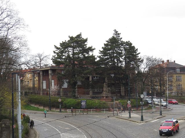 – po Havlově lávce nad Chotkovou ulicí – výhled vlevo na Bílkovu vilu, vpravo Kramářova vila