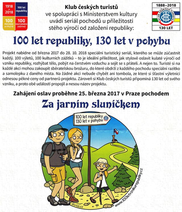 V sobotu 25. března 2017 byl zahájen unikátní projekt, kterým Klub českých turistů připomíná, že v roce 2018 oslavíme 100. výročí vzniku Československé republiky a 130. výročí založení KČT.