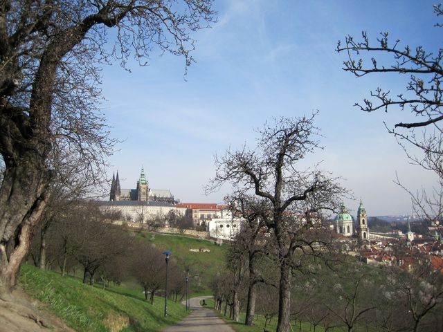Na Petříně je v současnosti 2 700 ovocných stromů – v této roční době umožňují překrásné výhledy na Prahu.