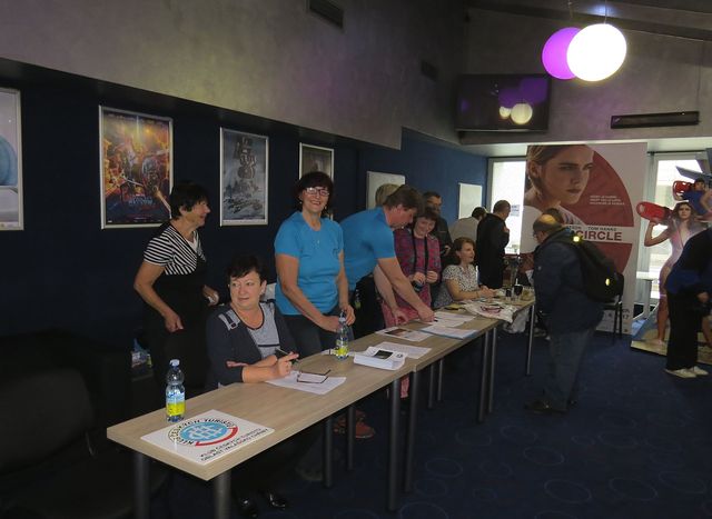 V sobotu 22. dubna 2017 byl hlavní festivalový den – prodlevy mezi původně ohlášeným a skutečným začátkem programu jsme ráno využili k setkávání 🙂 a procházce vnitřním městem. Když přišel čas, vizovičtí pořadatelé nás ve vestibulu zase jiného sálu multikina pěkně přivítali, podarovali nás Účastnickým listem a razítkem do Záznamníku 100 let republiky, 130 let v pohybu.
