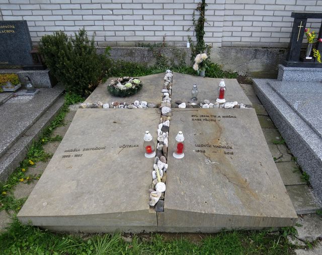 a kráčeli hlavní cestou stále vzhůru až ke zdi na nejvyšším a nejzazším místě hřbitova – tady je pochovaný spisovatel, autor manifestu Dva tisíce slov Ludvík Vaculík (1926–2015) – charakteristická a zcela v jeho stylu je věta napsaná na stránce kamenné knihy, pod níž, a pod křížem z oblázků, odpočívá: Byl jsem tu a možná zase přijdu.