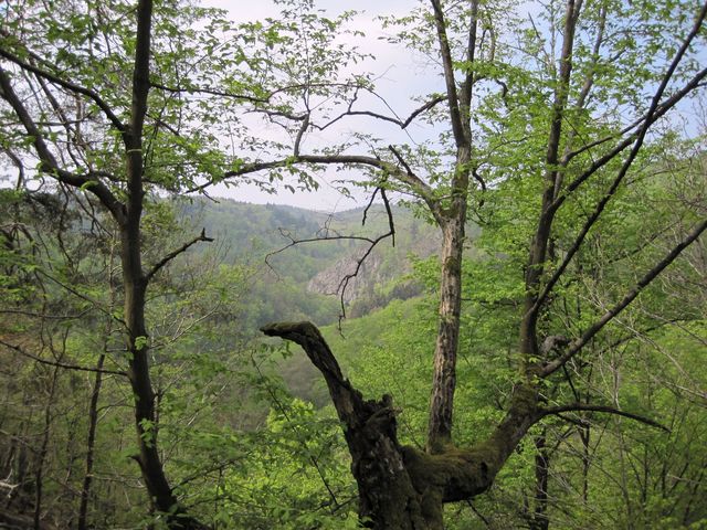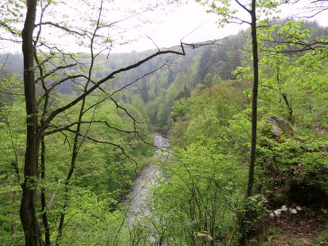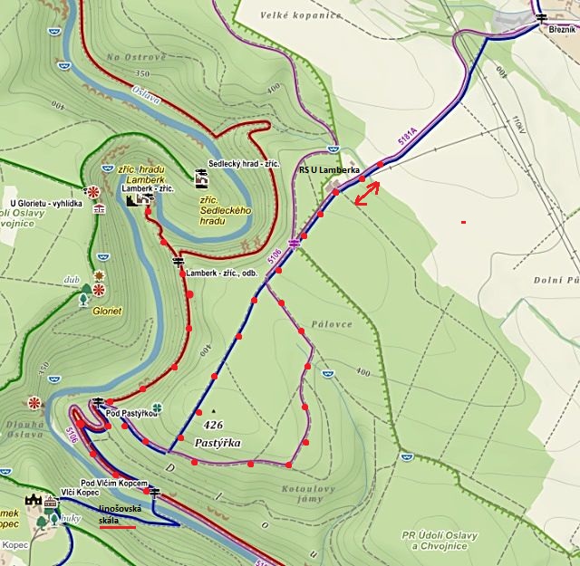 Z modré značky jsme odbočili vpravo a vydali se po neznačené původní přístupové cestě na Lamberk. Na srázu vlevo nad řekou svítil Gloriet, v dálce jsme tušili zámeček na Vlčím kopci (viz článek Seminář KČT 2016 v Kramolíně), od sevřeného zalesněného údolí řeky Oslavy jsme nemohli oči odtrhnout.