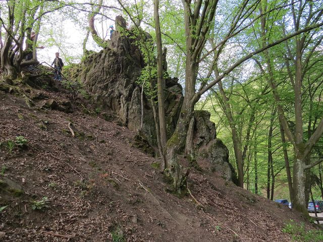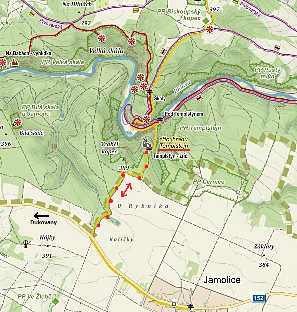 Autem jsme se vrátili na silnici k Mohelnu, přejeli řeku Jihlavu a před Dukovany zabočili vlevo – to už jsme vstoupili do přírodního parku Střední Pojihlaví. Když jsme uviděli žlutou značku přicházející od Jamolic, zabočili jsme vlevo a dojeli k hájence na provizorní parkoviště, odkud to není daleko na Templštejn. Vše klapalo jak na drátkách.