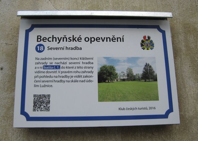 Dříve než opustíme klášterní zahradu, všimneme si cedulky, kterých jsou na trase Naučné stezky podél historického opevnění města asi dvě desítky – zásluhou Klubu českých turistů, konkrétně emeritního předsedy Ing. Jana Havelky, vznikl projekt, který, předpokládám, v plném rozsahu ocení až potomci dnešních obyvatel i návštěvníků – byly zmapovány, a taky opraveny a tím zachovány pro budoucnost, kamenné bašty začleněné do středověkého opevnění Bechyně. Následující článek se bude týkat této unikátní naučné stezky, zatím jen malá ochutnávka: