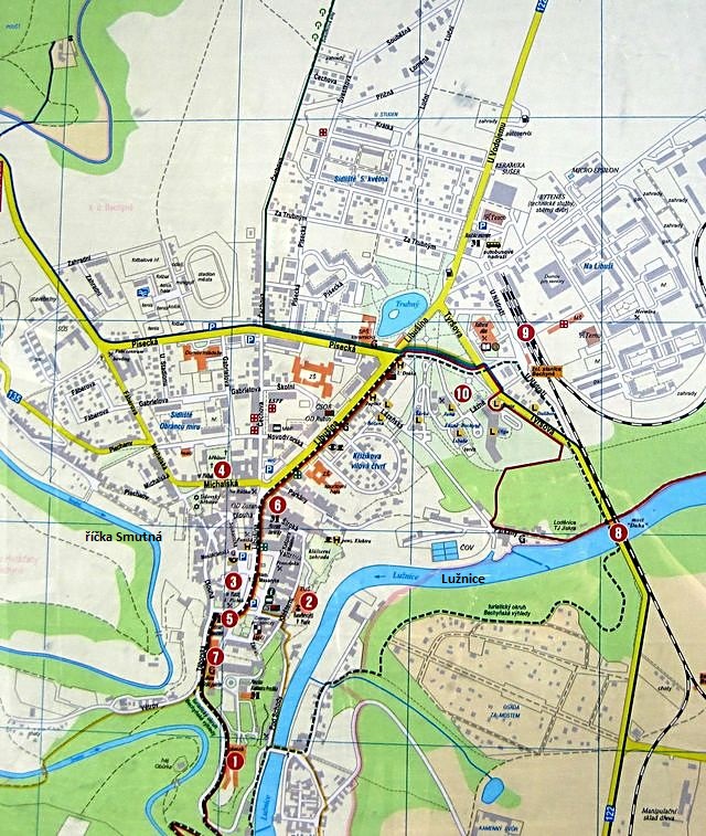 1 – zámek, 2 – klášter s kostelem Nanebevzetí Panny Marie, 3 – kostel sv. Matěje, 4 – kostel sv. Michala, 5 – Městské muzeum, 6 – Muzeum turistiky (tomu věnuji samostatný článek), 7 – bývalý zámecký pivovar, 8 – most zvaný Bechyňská duha, 9 – ČD, 10 – lázně Bechyně.