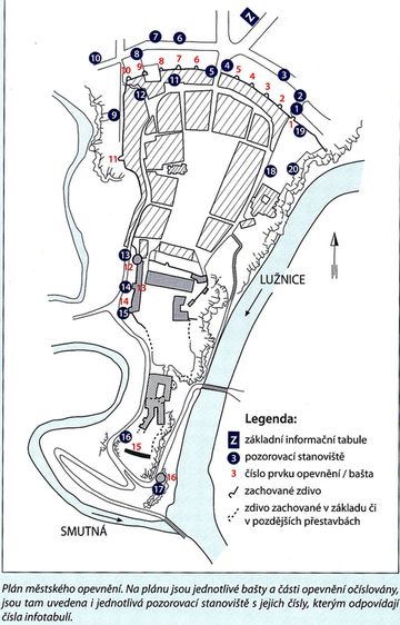 Jistě si se zájmem prohlédnete plánek městského opevnění, z něhož je patrné umístění pozorovacích stanovišť, ale hlavně jsou na něm zaznamenané jednotlivé bašty, červeně očíslované, z nichž většinu jsme v doprovodu Ing. Havelky na naučné stezce viděli.