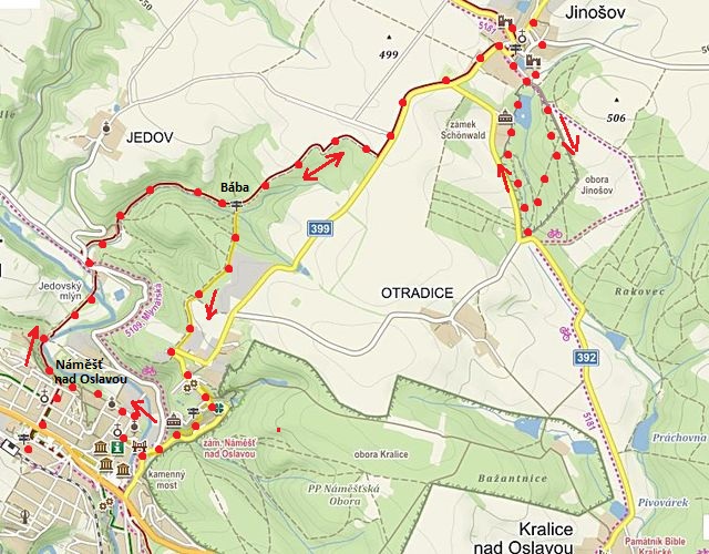 Po turistické stezce pro pěší jsme scházeli ze zámeckého ostrohu k řece Oslavě, abychom ji po barokním mostě překročili a vstoupili do centra města.