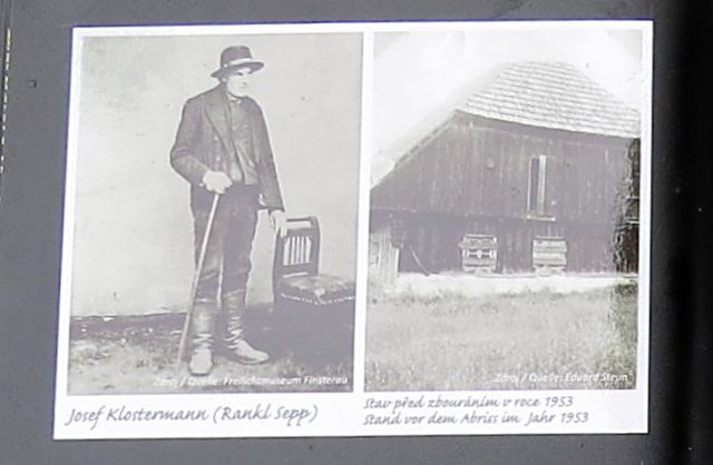 V lokalitě U Tří jedlí jsme se zastavili u odbočky na nedalekou paseku Ranklov, jednu z nejdrsnějších šumavských lokalit ve výšce asi 1 100 metrů, kterou jsme už několikrát navštívili, a přečetli si novou tabuli, která informuje o siláku šumavském Josefu Klostermannovi, alias Seppu Ranklovi a jeho rodné chalupě, v níž po léta žil se svou o mnoho let mladší ženou Cecilkou, která pocházela z nedalekého Zhůří a s níž vychoval sedm dětí. Dobrák Sepp Rankl měl úžasnou fyzickou sílu a vstřícné a široké srdce, živil se povoznictvím – na sklonku života se odstěhoval do Jáchymova u Stach, zemřel roku 1888.