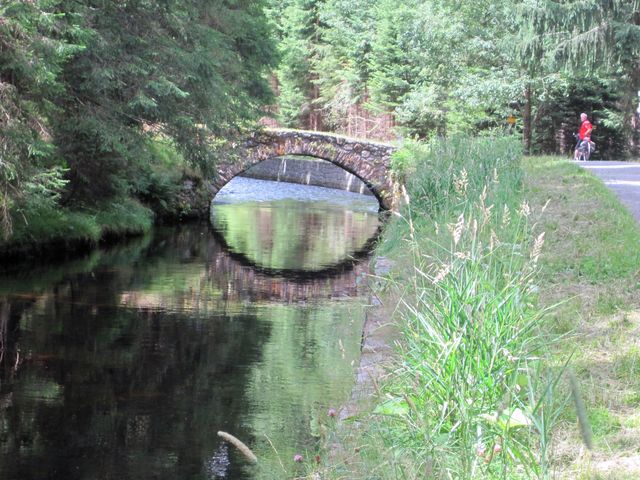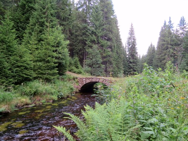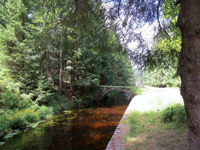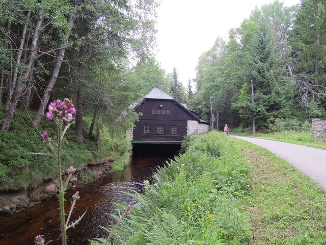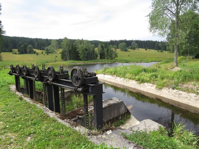 Situace se vyvinula tak, že v pátek 21. července jsme se toulali včerejším deštěm řádně omytou šumavskou přírodou jen ve dvou – vyjeli jsme až v 9:30 a hlavním tématem dne se stal Vchynicko-Tetovský vodní kanál, vystavěný Ing. Rosenauerem v letech 1799–1800 pro plavení dřeva. Kanál o šířce 1 – 5 metrů spojoval řeku Vydru s Křemelnou a obcházel nesplavný, kamenitý úsek Vydry. Od konce 30. let minulého století slouží ale 14,4 km dlouhá stoka jako přivaděč vody pro elektrárnu Vydra dostavěnou v roce 1942 – využívá spádu řeky Vydry mezi Hradlovým mostem a Čeňkovou pilou. Všechnu vodu z kanálu pojme v místě vzdáleném 9,5 km od Hradlového mostu vtokový objekt – podzemním přivaděčem o délce 3 218 metrů putuje voda do akumulační nádrže, z té do vyrovnávací komory a pak do vlastní elektrárny s výkonem 6,4 MW.